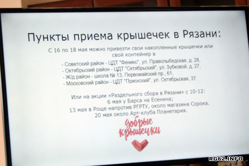 Среди школ и детских садов города Рязани объявлен конкурс по сбору пластиковых крышек – некоторые образовательные учреждения уже заинтересовались акцией и заявили о желании принять участие. Оставить заявку на участие в проекте можно по ссылке. С 16 по 18 мая в рамках данного конкурса приём крышек будет организован в следующих пунктах сбора: