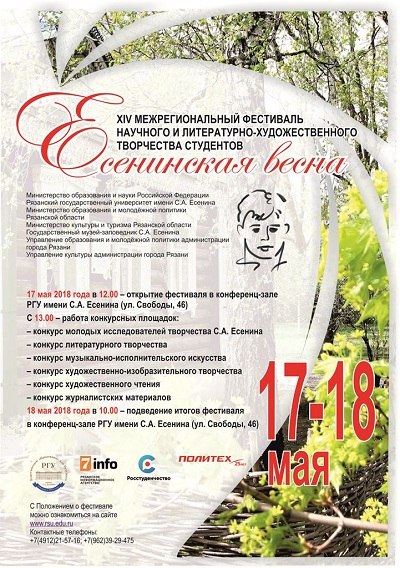 17-18 мая 2018 года в Рязани будет проходить XIV Межрегиональный фестиваль научного и литературно-художественного творчества «Есенинская весна». Площадкой его проведения станет РГУ имени С.А. Есенина
